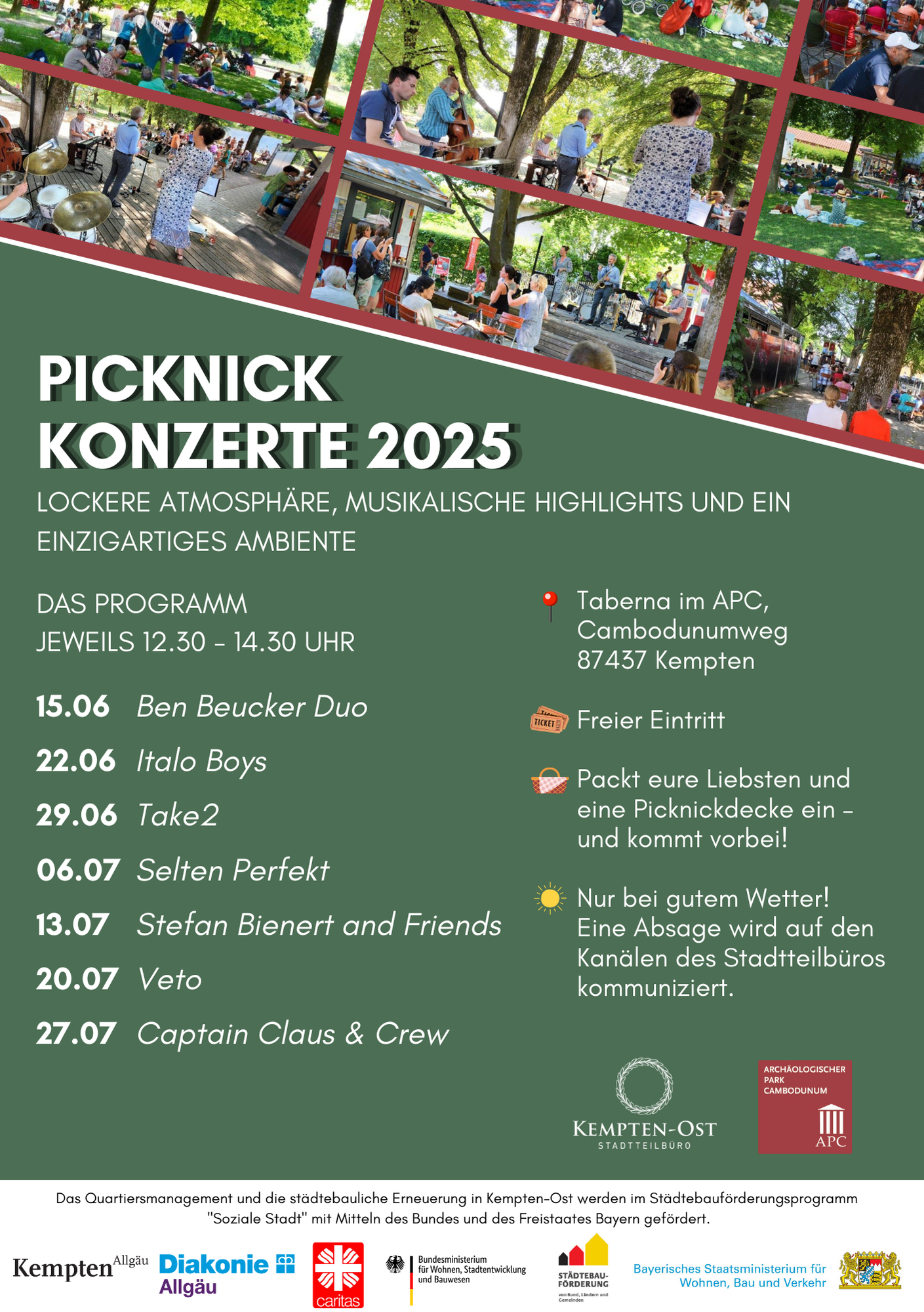 In diesem Sommer finden wieder die beliebten Picknick Konzerte im Archäologischen Park Cambodunum (APC) statt. Erstmals werden die Konzerte in Kooperation zwischen dem Stadtteilbüro Kempten-Ost und dem APC organisiert.