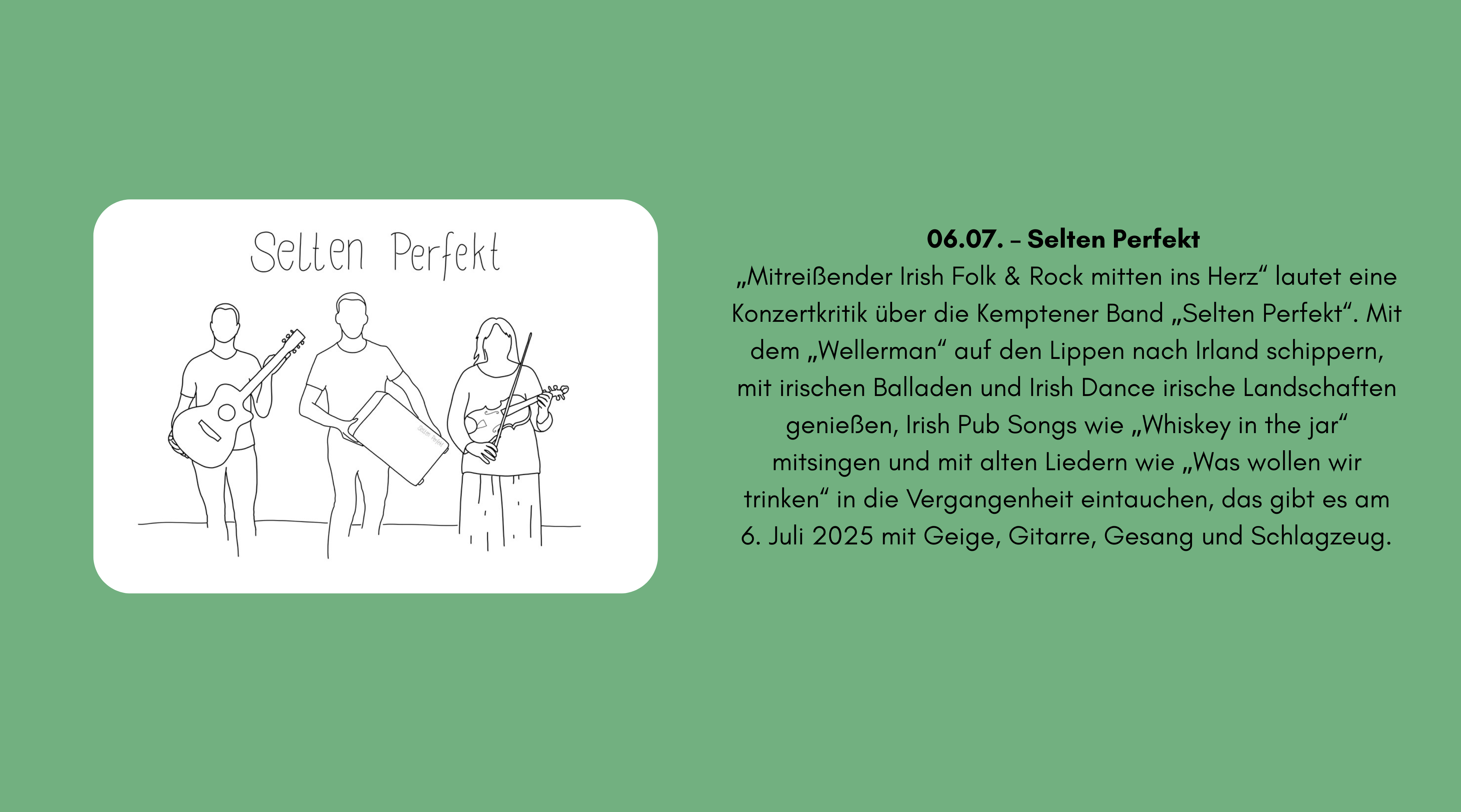 Bereits in den vergangenen Jahren begeisterte die Konzertreihe mit entspannter Atmosphäre, stimmungsvoller Musik und dem besonderen Ambiente vor der Taberna im APC (Cambodunumweg, 87437 Kempten). In diesem Jahr wird das bewährte Format fortgesetzt – an sieben Sonntagen im Juni und Juli, jeweils von 12:30 bis 14:30 Uhr.