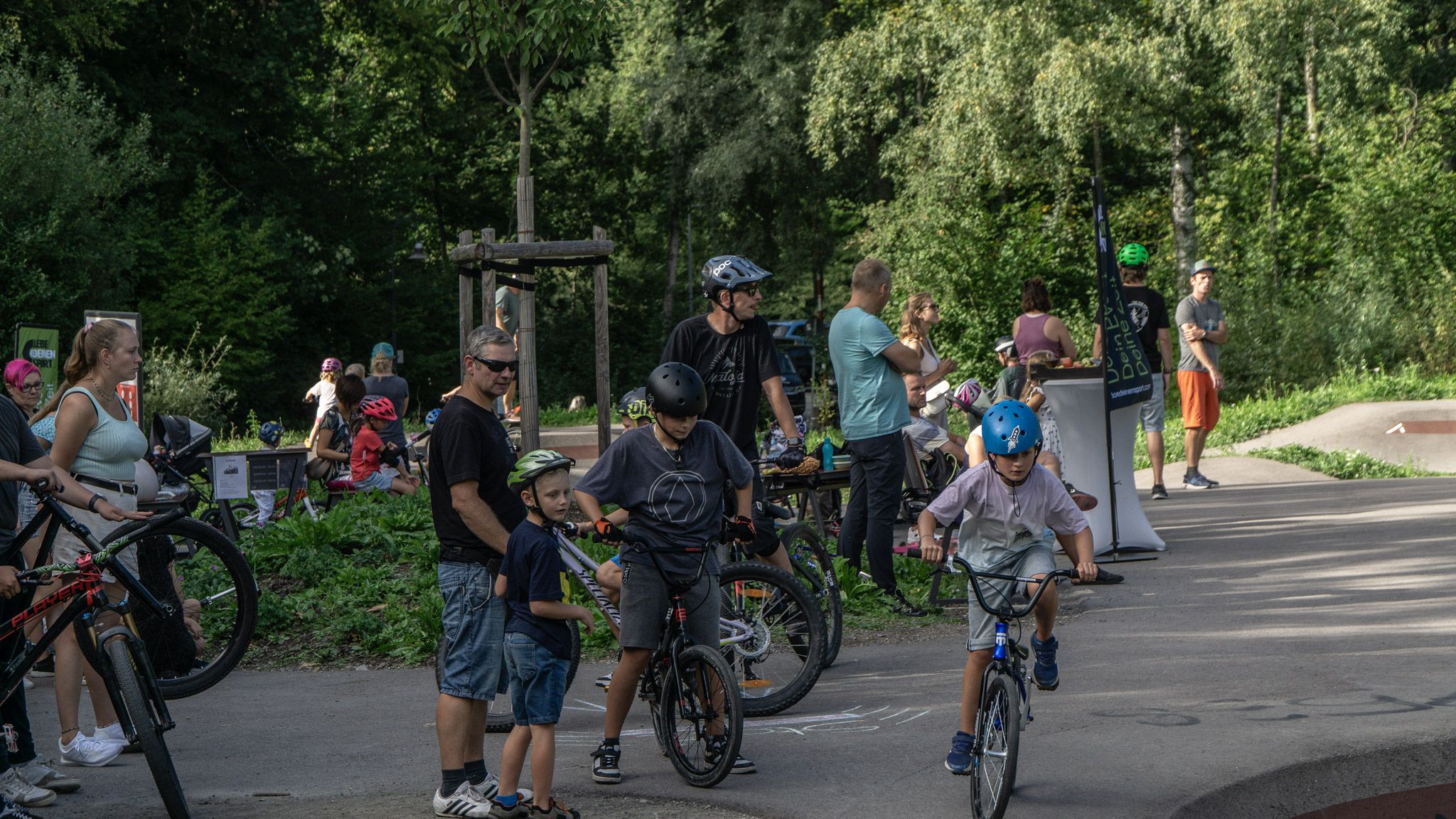 Schon vormittags drehten die ersten Kids und Jugendlichen fleißig ihre Runden auf dem Pumptrack im Engelhaldepark, stets begleitet von guter Musik und Kinderlachen. Auch für ausreichend Energie war dank gesunder Snacks, bereitgestellt von der Agentur „Lebe deinen Sport“, gesorgt. Profisportler Philip Schaub stellte zudem ausreichend kostenlose Bikes samt Helm für alle Interessierten bereit. Dank seiner professionellen Anleitung konnten Groß und Klein, auch ohne eigenes Bike oder Vorerfahrungen, Runden im Pumptrack drehen. Dieses Angebot wurde von zahlreichen Kids dankend angenommen. Auch den erfahrenen Pumptrack Fahrern konnte Philip den ein oder anderen Tipp mit auf den Weg geben und sie im Speed Training coachen.