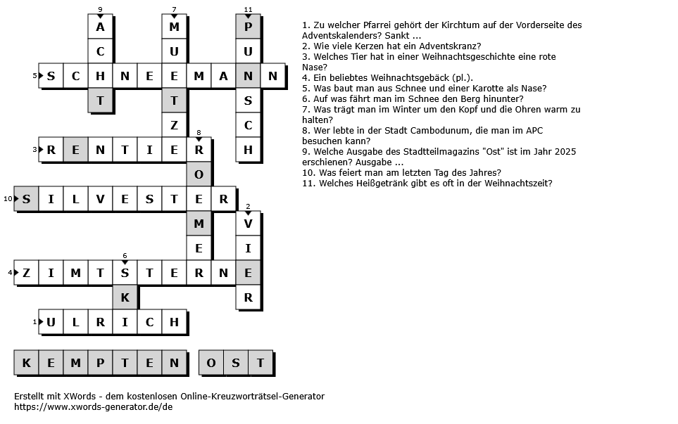 Hinter dem ersten Türchen unseres Adventskalenders erwartet dich ein kleines Kreuzworträtsel, das du dir hier herunterladen kannst. Wer keinen Drucker parat hat, kann gerne im Stadtteilbüro vorbeikommen, sich einen Ausdruck abholen und dann gemütlich im Arkadencafé am Lösungswort knobeln.